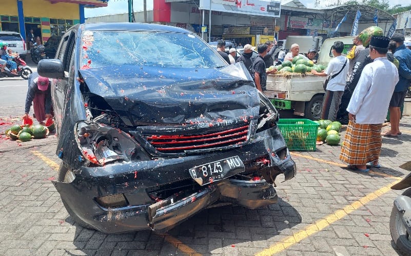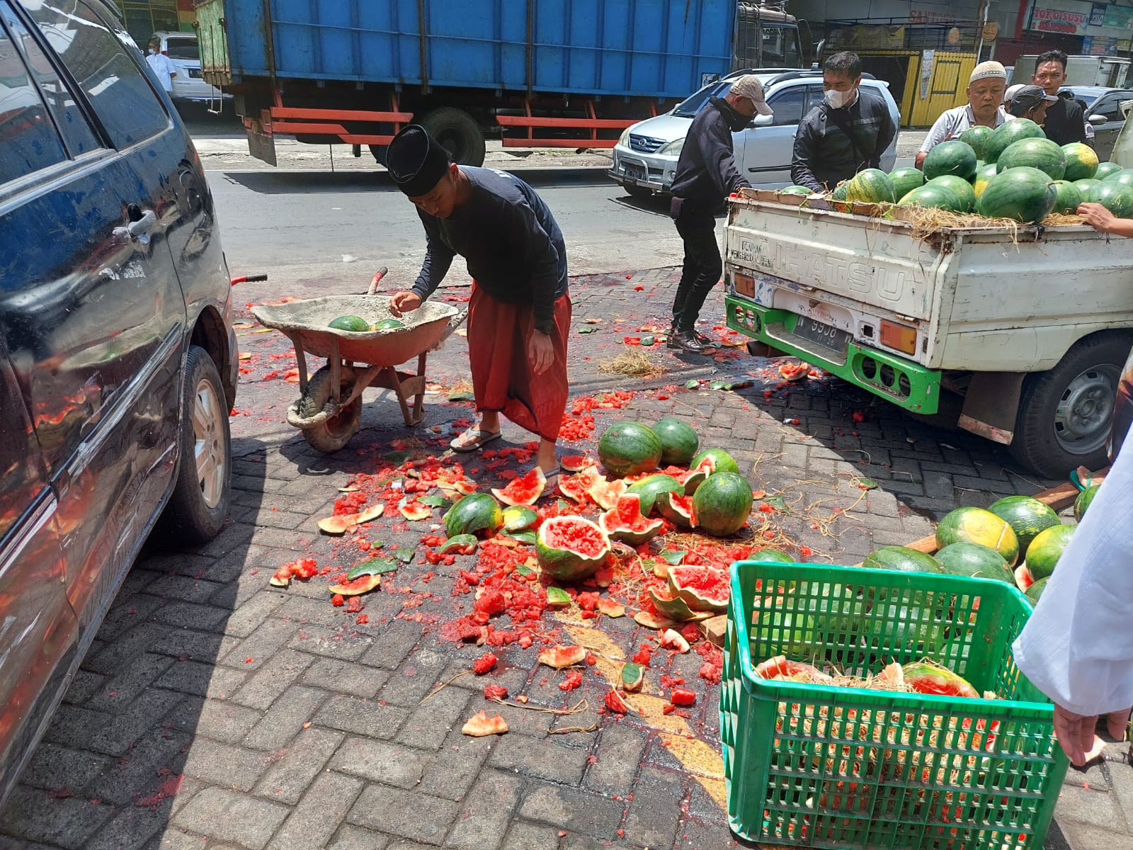 Tidak hanya disitu saja, mobilnya menabrak lapak penjual semangka hingga mengakibatkan buahnya berhamburan di tengah jalan.