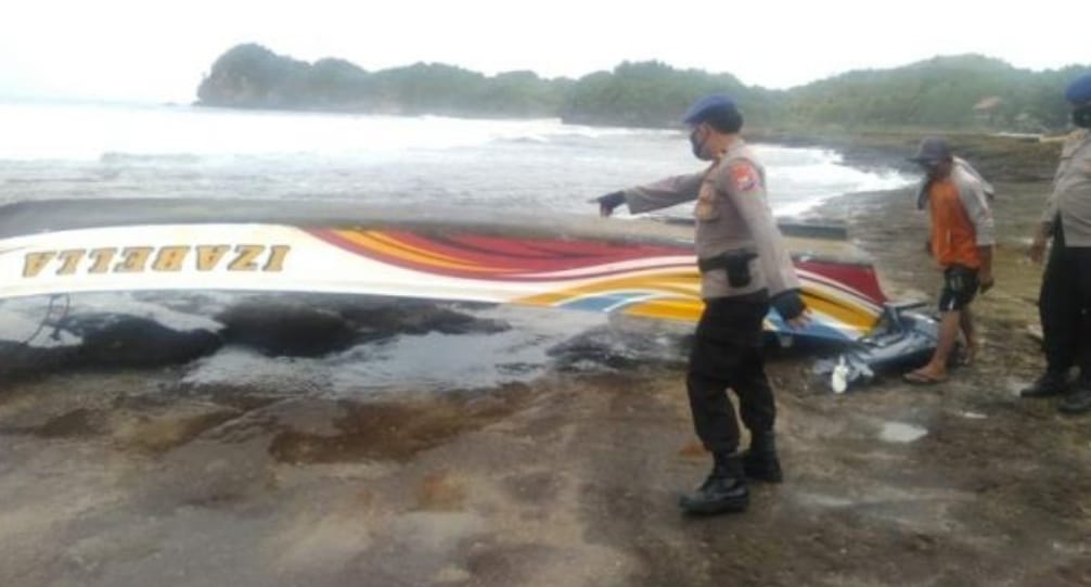 Brilian°Malang – Perahu ‘Izabela’ terbalik usai diterjang ombak Pantai Jolangkung Kecamatan Gedangan Kabupaten Malang. Akibatnya, seorang nelayan tewas tenggelam.