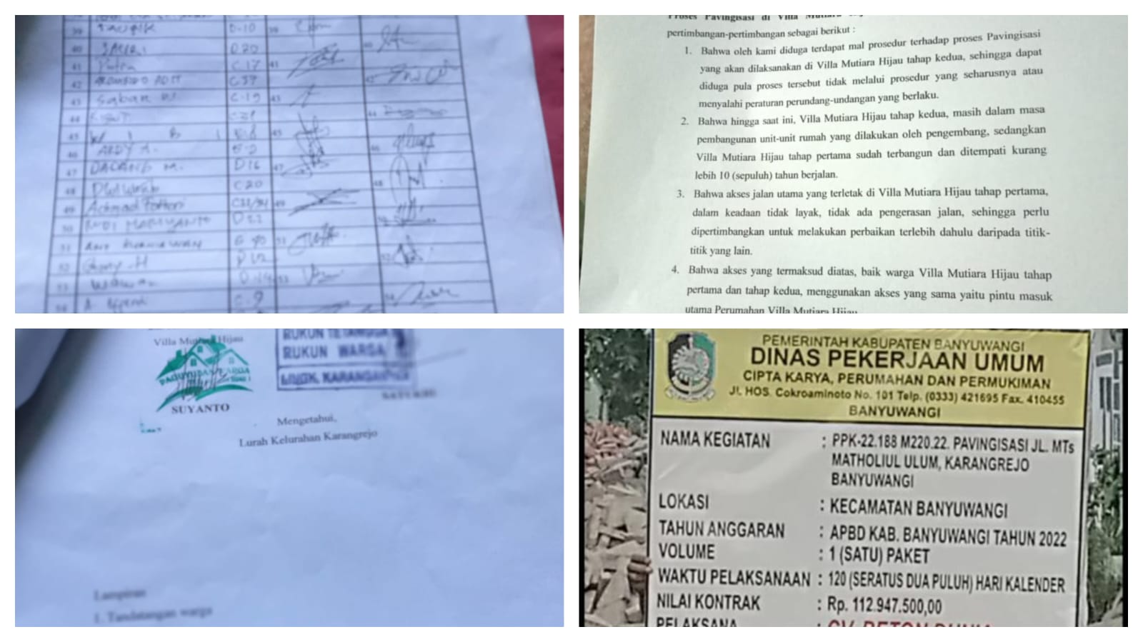 Brilian°Banyuwangi – Pengerjaan pemeliharaan jalan kegiatan Pavingisasi di Perumahan Villa Mutiara Hijau, Kelurahan Karangrejo, Kecamatan Banyuwangi di pertanyakan warga tentang Prosedur turunnya pengerjaan jalan itu yang Prasarana Sarana Umum (PSU) jalannya belum di serahkan ke Pemerintah Kabupaten (Pemkab) Banyuwangi tersebut anggarannya itu diduga fiktif. Jumat (30/09/2022).