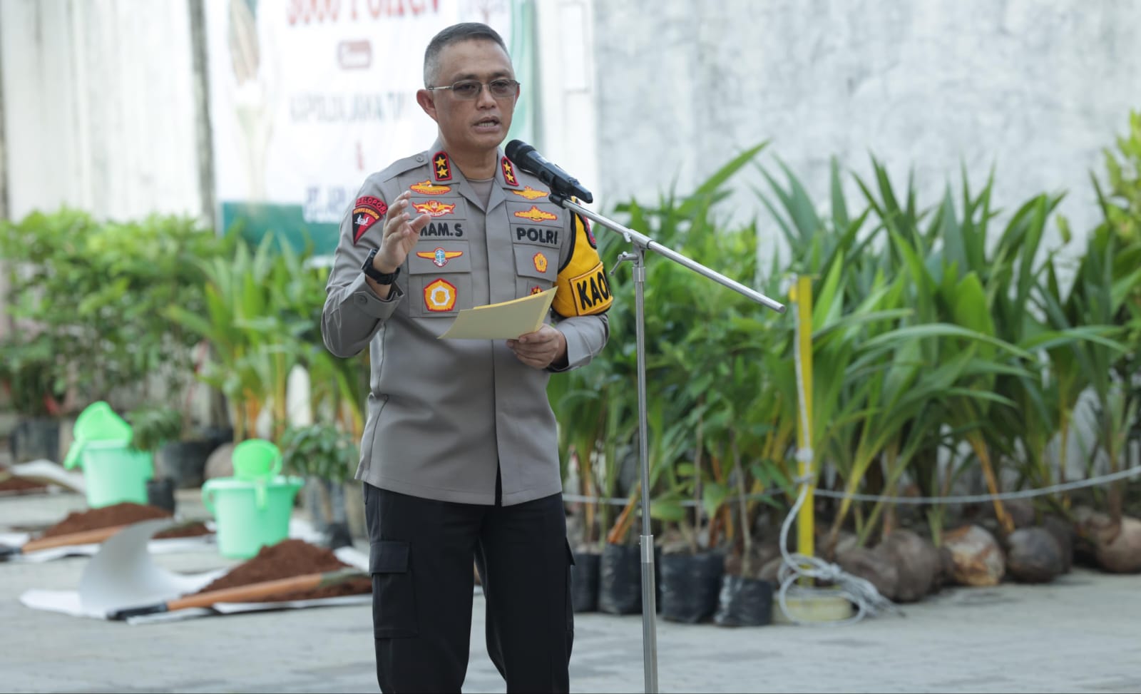 Kapolda Jatim, Kapolres Gresik, dan Dirut PT. Aplus Pasific kemudian menyerahkan bibit pohon kepada perwakilan dari Kepala Desa Prupuh, Kepala Desa Ketanen, Kepala Desa Delegan, dan Kepala Desa Banyutengah.