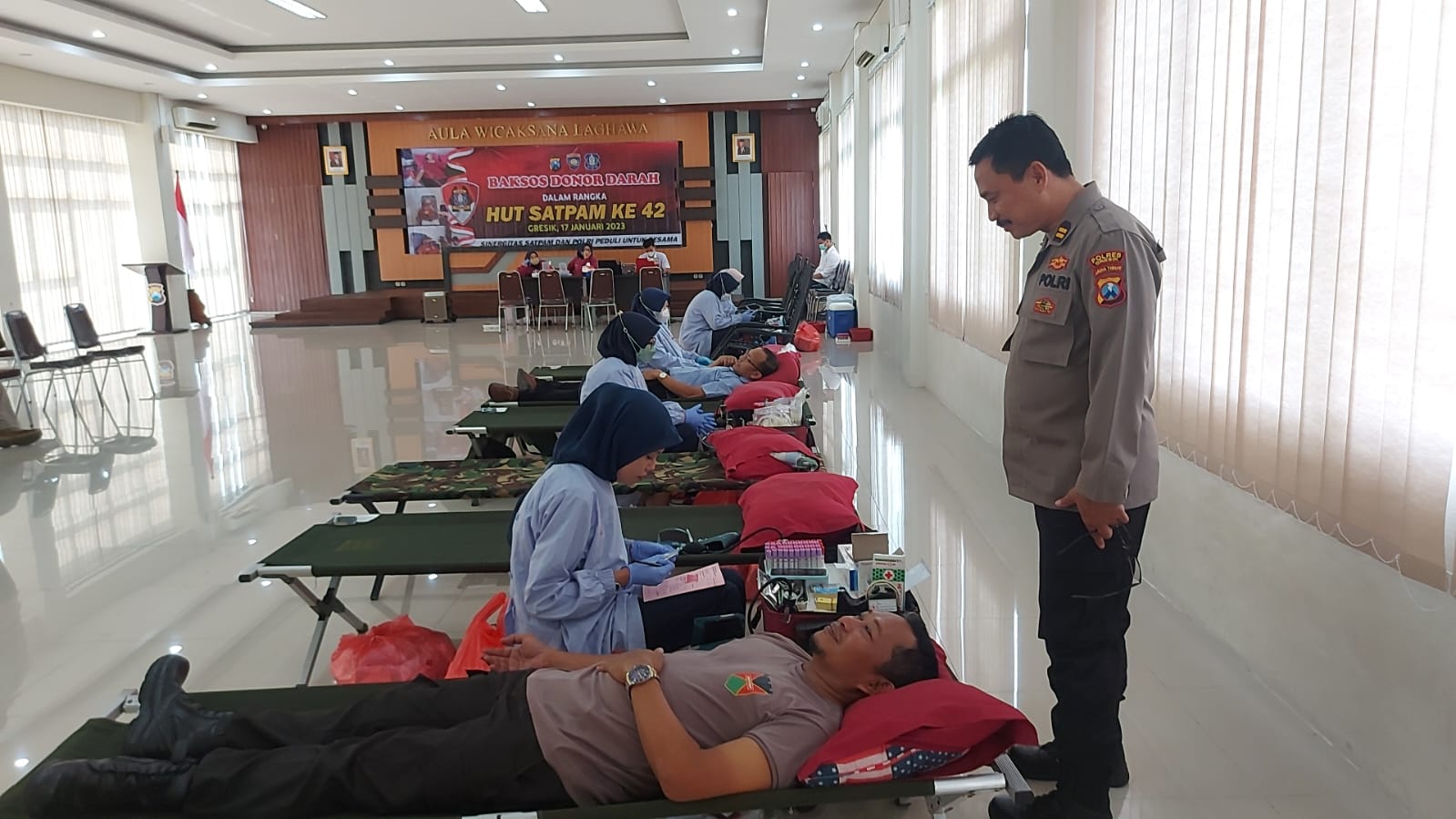 Brilian°Gresik – Puluhan personel gabungan Satuan Pengamanan (Satpam) di Kabupaten Gresik hari ini, gelar Bakti Sosial (Baksos) donor darah di Aula Wicaksana Laghawa, Polres Gresik, Jalan. DR. Wahidin Sudiro Husodo No.214, Kembangan, Kecamatan Kebomas, Kabupaten Gresik, Jawa Timur.