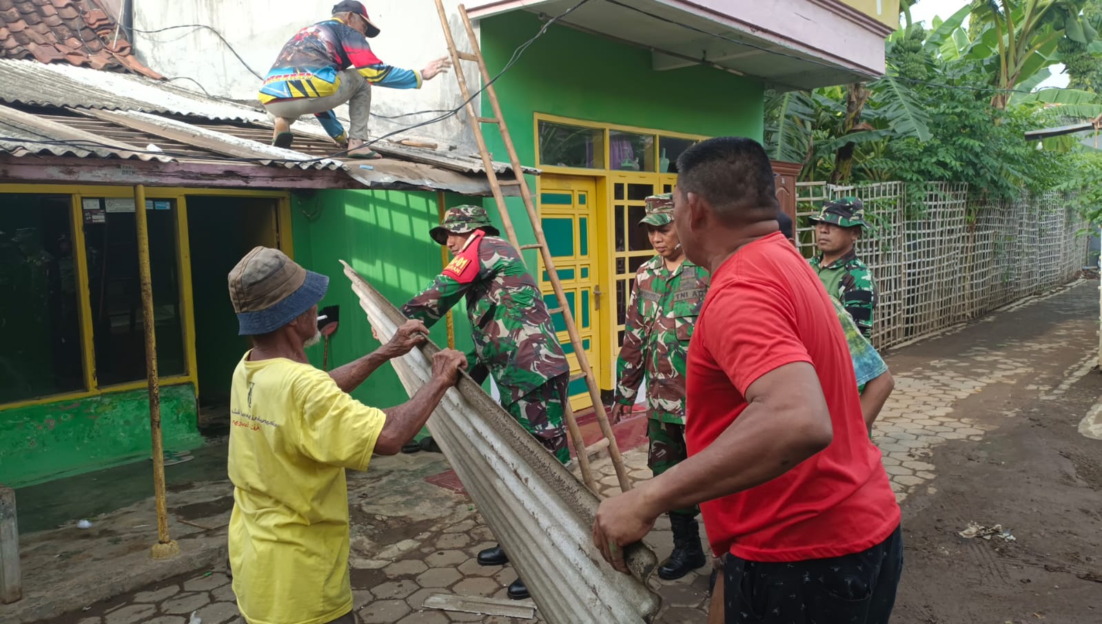 Brilian-news.id | Probolinggo – Guna terciptanya sinergitas TNI bersama rakyat, Sertu Hasbul Halili Bersama 4 orang anggota Babinsa dari Koramil 0820/ 01 Kanigaran melaksanakan karya bakti membantu perbaiki atap rumah milik salah seorang warga binaannya, Jln. Wahid Hasim Rt.06 / Rw. 01 Kelurahan Kanigran Kecamatan Kanigaran Kota Probolinggo. Minggu (7/1) pagi.