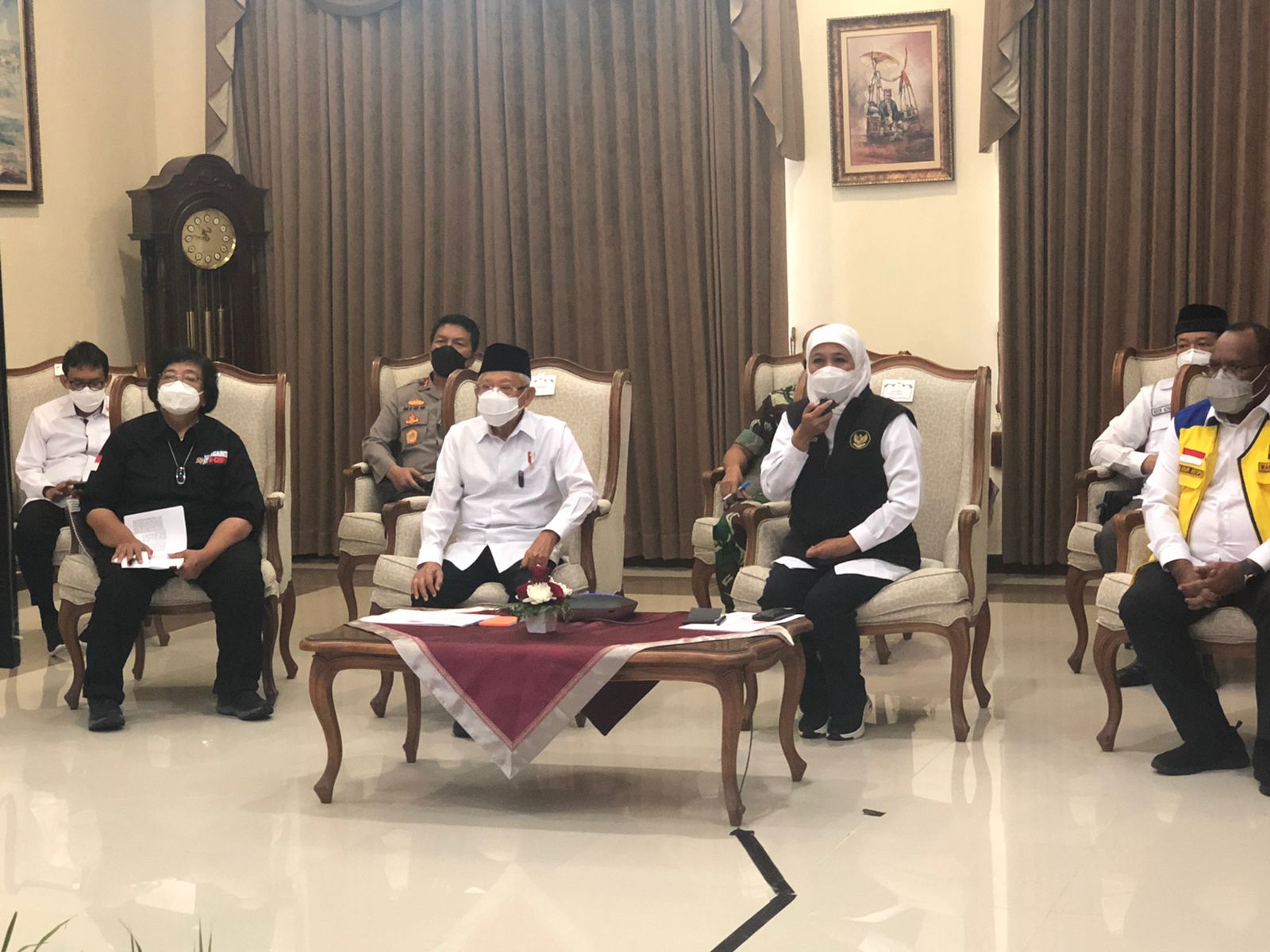 Brilian°Surabaya, – Wakil Presiden RI K.H Ma’ruf Amin bersama Forkopimda Jawa Timur melakukan zoom meting dengan Forkopimda kabupaten Lumajang yang berada di Posko Tanggap Darurat Bencana Alam, Awan Panas dan Guguran (APG) Gunung Semeru, pada Kamis siang (16/12/2021) di VIP Pemprov Bandara Juanda.