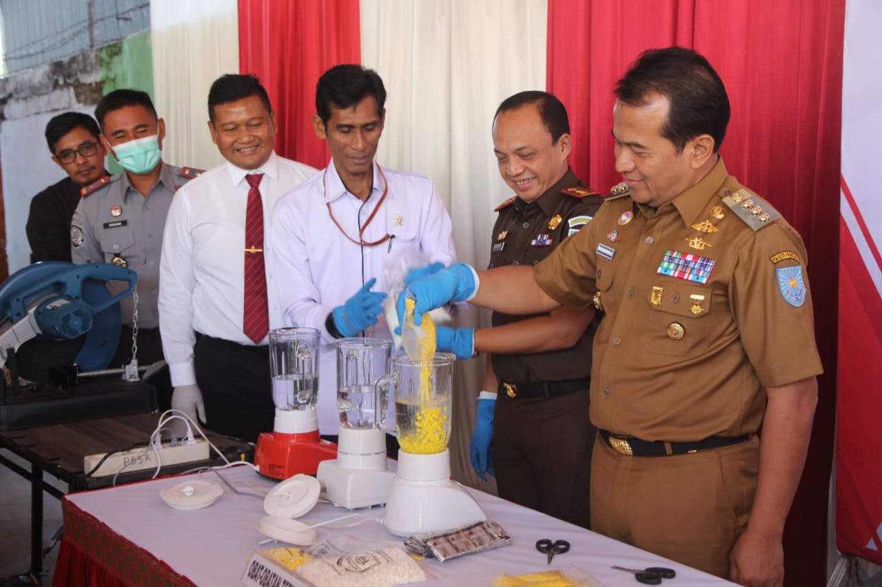 Adapun barang bukti yang dimusnahkan diantaranya berupa narkotika jenis pil trihexiphenidyl sebanyak 2.941 butir, pil dextromethorphan 3.072 butir, sabu 21,51 gram, plastik klip 1.257 dan telepon genggam 4 unit serta sejumlah barang bukti kejahatan lainnya.