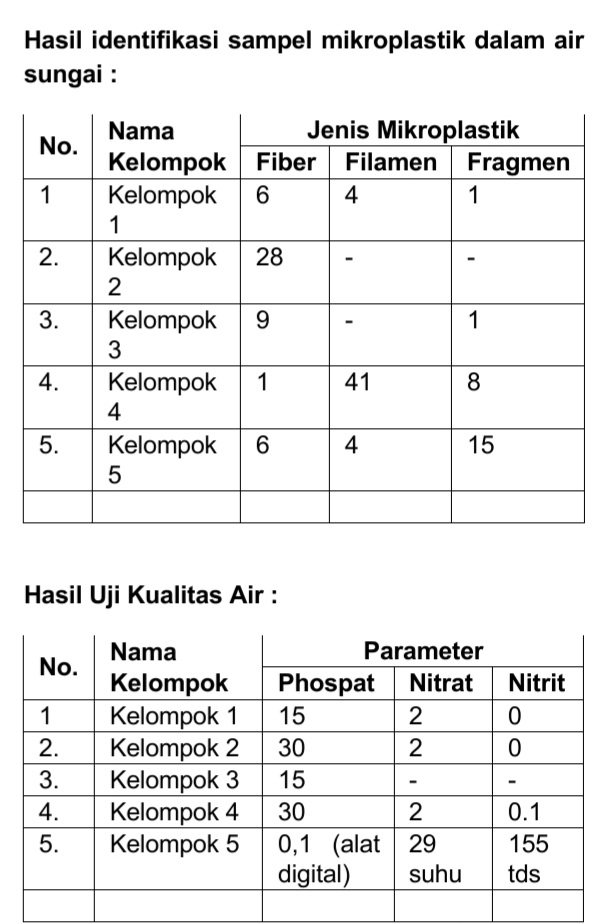 Dari ke lima sampel yang di ambil di sungai Surabaya, ditemukan mikroplastik dengan jenis Fragmen, Filamen dan Fiber. Hal ini menunjukkan bahwa sungai brantas sudah terkontaminasi mikroplastik.