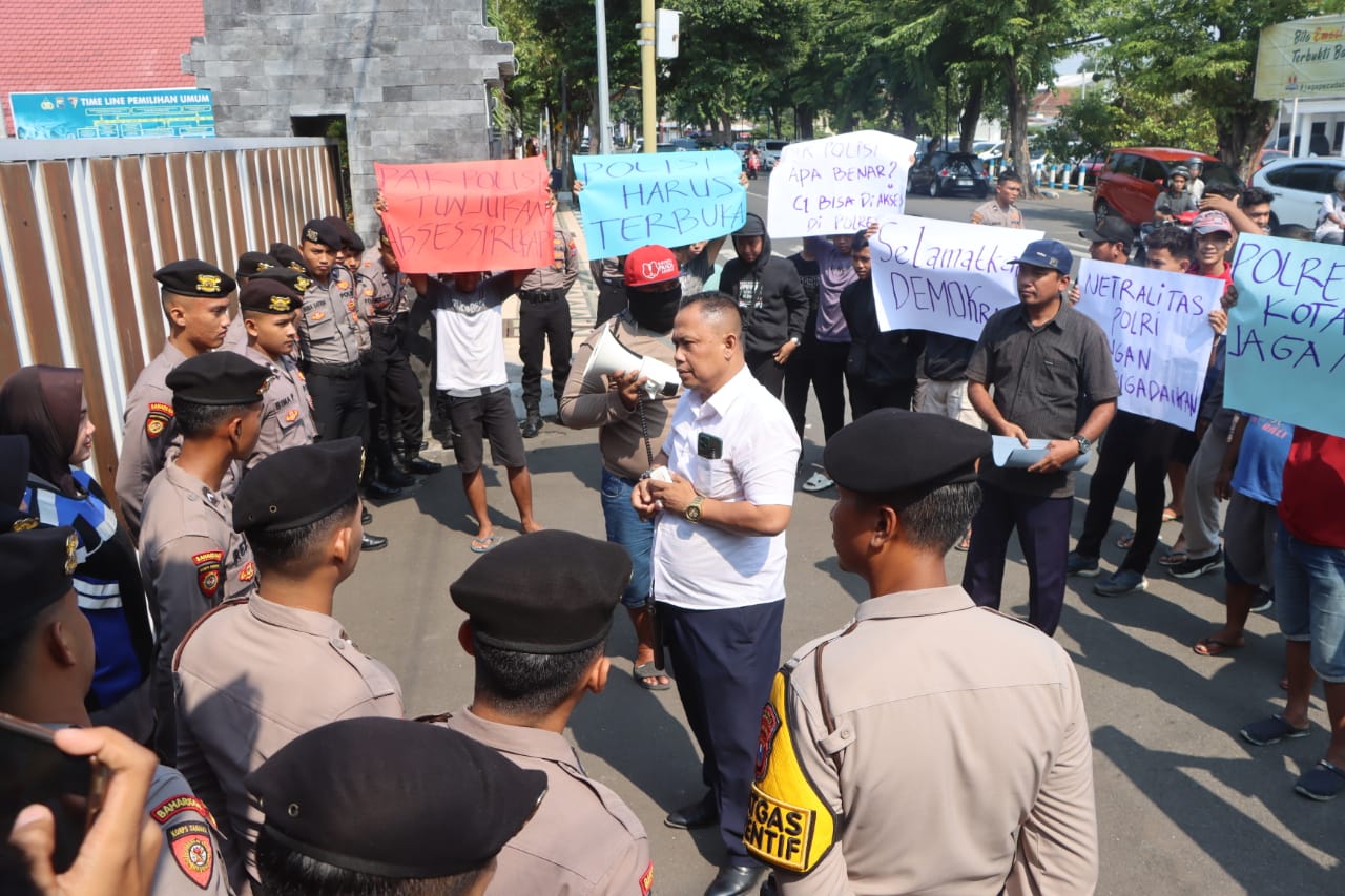 Aksi unjuk rasa tersebut berakhir dengan damai dan mereka menerima penjelasan Polres Pasuruan Kota yang diwakili oleh Wakapolres dengan pernyataan tegas menjunjung tinggi Netralitas Polri pada Pemilu 2024.