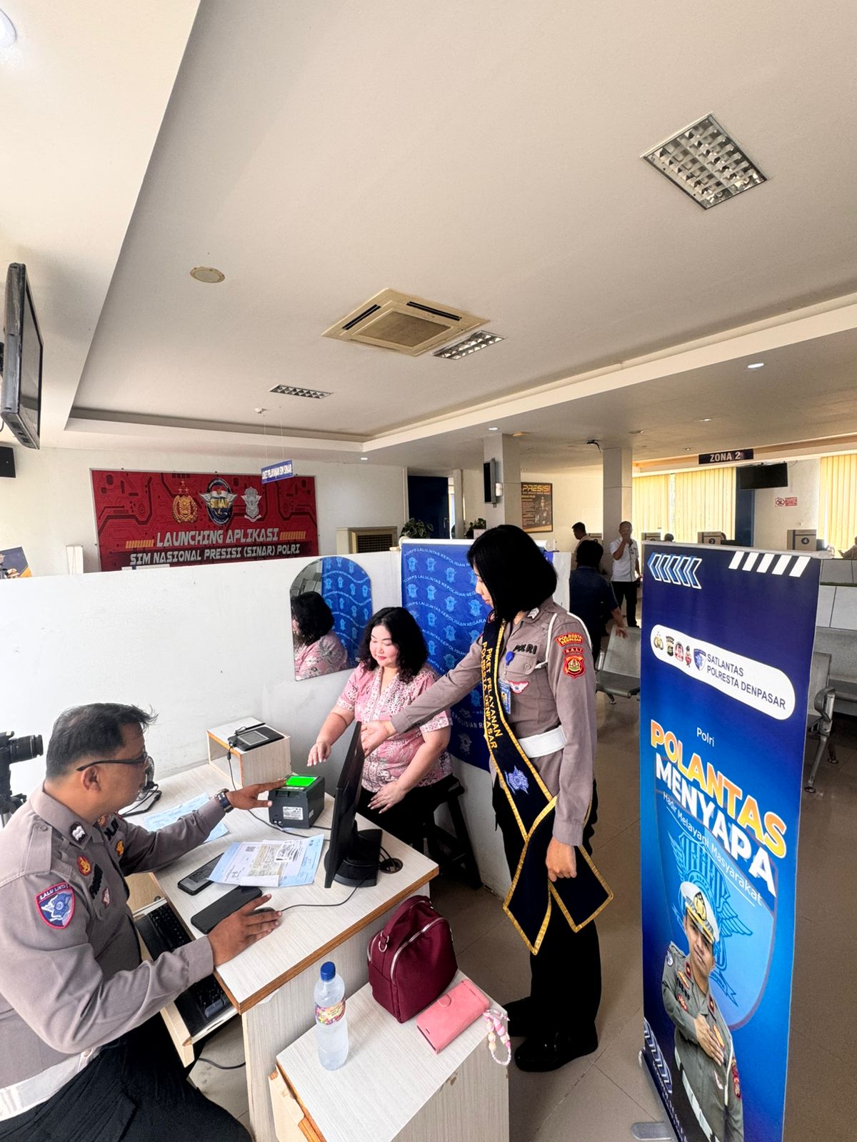 Pelayanan yang berlangsung di ruang pelayanan Satpas SIM Polresta Denpasar ini terlihat memberikan kemudahan bagi pemohon SIM. Petugas dengan sigap membantu proses perekaman data, termasuk verifikasi identitas menggunakan perangkat biometrik, guna memastikan keakuratan dan keamanan data pemohon.