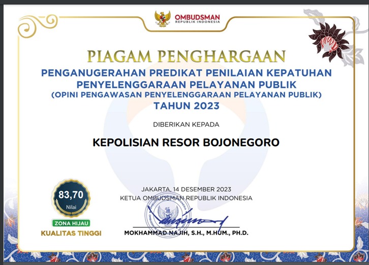 “Mudah-mudahan dengan penghargaan ini Polres Bojonegoro bisa terus memberikan pelayanan yang terbaik untuk masyarakat dan ini akan selalu menjadi motivasi kami,” pungkasnya.
