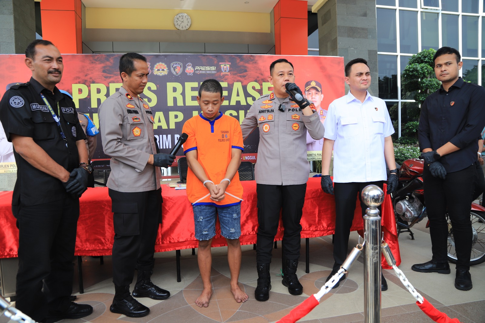 Brilian°Gresik – Polres Gresik mengelar Press Release pelaku pencurian sepeda motor yang beraksi di perumahan. Pelaku curanmor diringkus di samping poskamling RT03/ RW 20 Perum Alam Bukit Raya (ABR) Desa Suci, Kecamatan Manyar, Kabupaten Gresik.