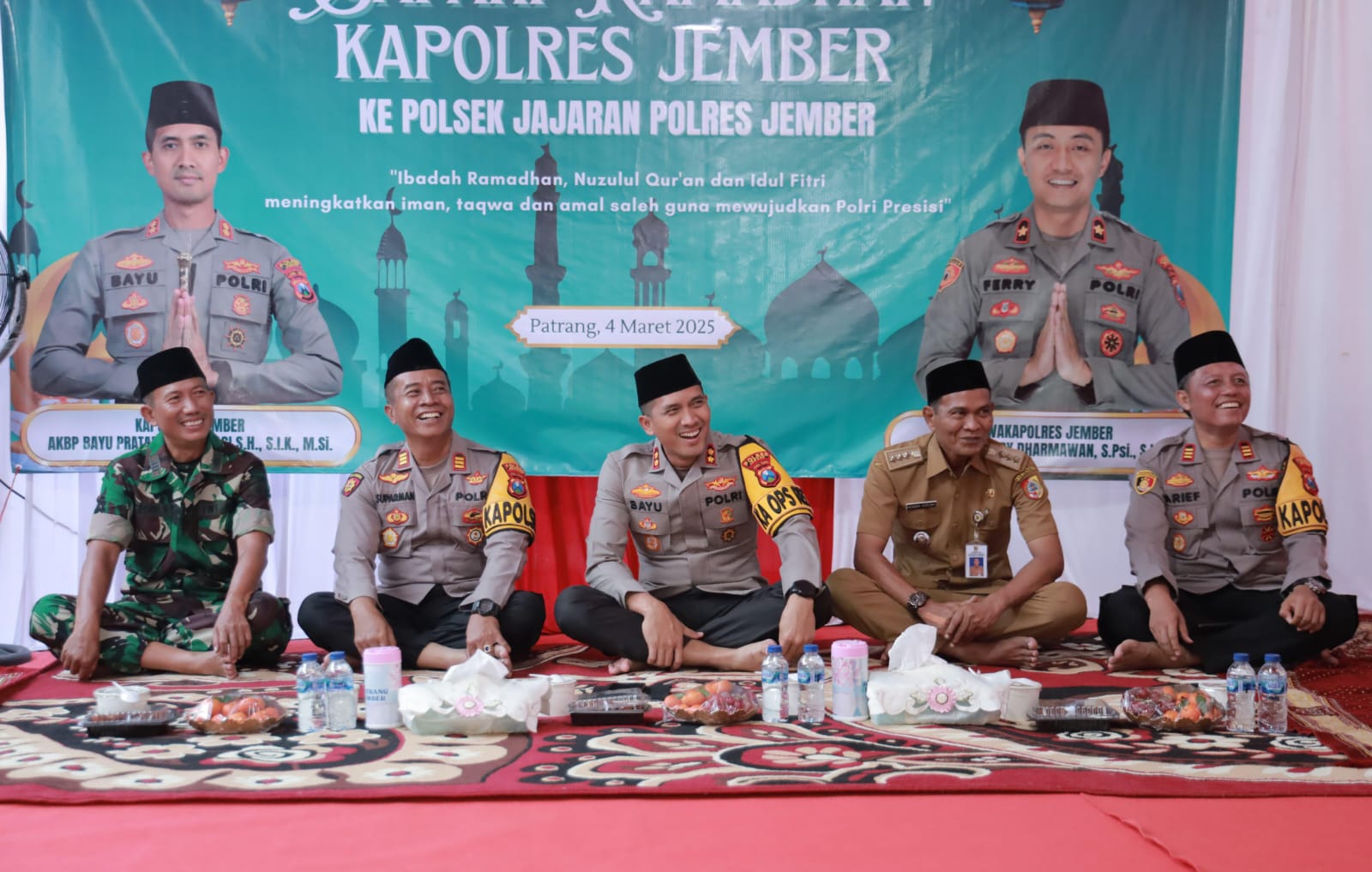 Brilian-news.id | JEMBER – Hari ke Lima di Bulan Suci Ramadan 1446 Hijriyah, Kapolres Jember AKBP Bayu Pratama Gubunagi, S.H., S.I.K., M.Si., menggelar kegiatan Safari Ramadan perdananya di wilayah Rayon 1 jajaran yang mencakup Polsek Patrang, Polsek Arjasa, Polsek Kalisat, Polsek Jelbuk, dan Polsek Sukowono.