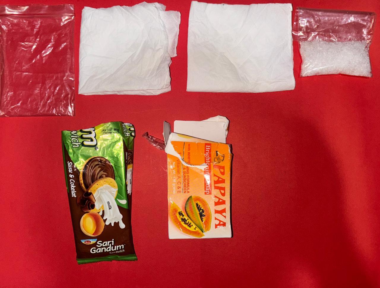 Selain itu Polisi juga mengamankan 1 unit handphone warna hitam, serta beberapa barang lain seperti bekas bungkus jajan dan sabun yang digunakan untuk menyamarkan sabu.