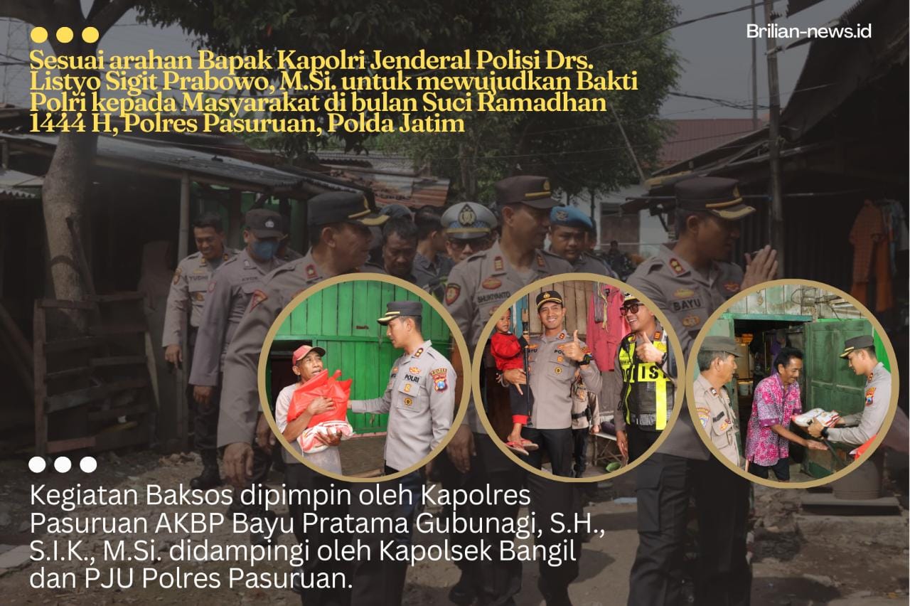 Brilian°PASURUAN – Sesuai arahan Bapak Kapolri Jenderal Polisi Drs. Listyo Sigit Prabowo, M.Si. untuk mewujudkan Bakti Polri kepada Masyarakat di bulan Suci Ramadhan 1444 H, Polres Pasuruan, Polda Jatim terhitung sejak kemarin lusa menggelar Bakti Sosial (Baksos) berupa pemberian paket Sembako kepada masyarakat kurang mampu di wilayah Kabupaten Pasuruan.