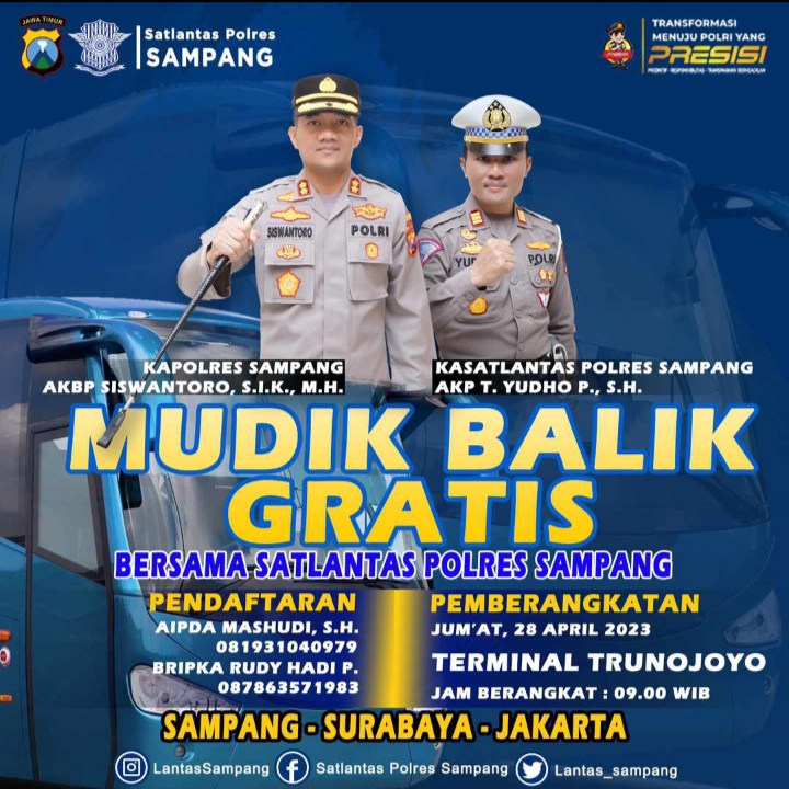 Kepada masyarakat yang akan mengikuti “Mudik Balik Gratis” Polres Sampang agar menghubungi nomor hotline terlebih dahulu yaitu 081931040979 (Aiptu Mashudi) dan 087863571983 (Bripka Rudi).