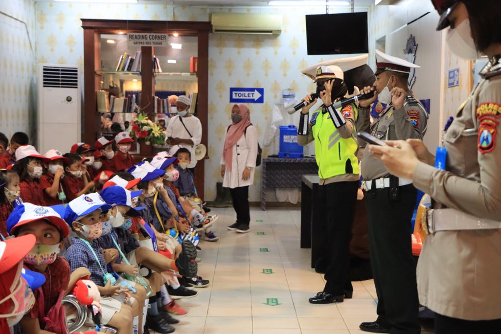 Bertempat di Mako Polres Tuban puluhan anak-anak dari Kelompok bermain (KB) dan Taman Kanak-kanak (TK) Tunas Bangsa terlihat sangat antusias mengikuti rangkaian kegiatan yang di pandu oleh Kanit Dikyasa Satlantas Polres Tuban Ipda Kistelya Ray Patamaya, S.TrK.