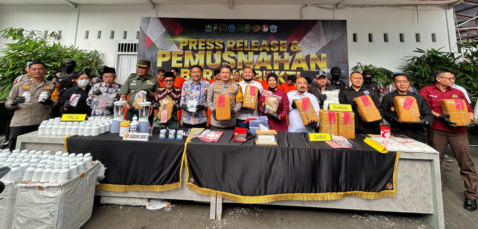 “Pemusnahkan barang bukti narkoba yang berhasil kami sita dari 9 laporan polisi. Barang bukti ini terdiri dari 1,5 kg Sabu, 44,216 kg Ganja, 391 butir Ekstasi, 19.000 butir Carnophen, dan 50.000 butir Pil Koplo berlogo ££,” ujar Kombes Pol Budi Hermanto,Rabu (22/05).