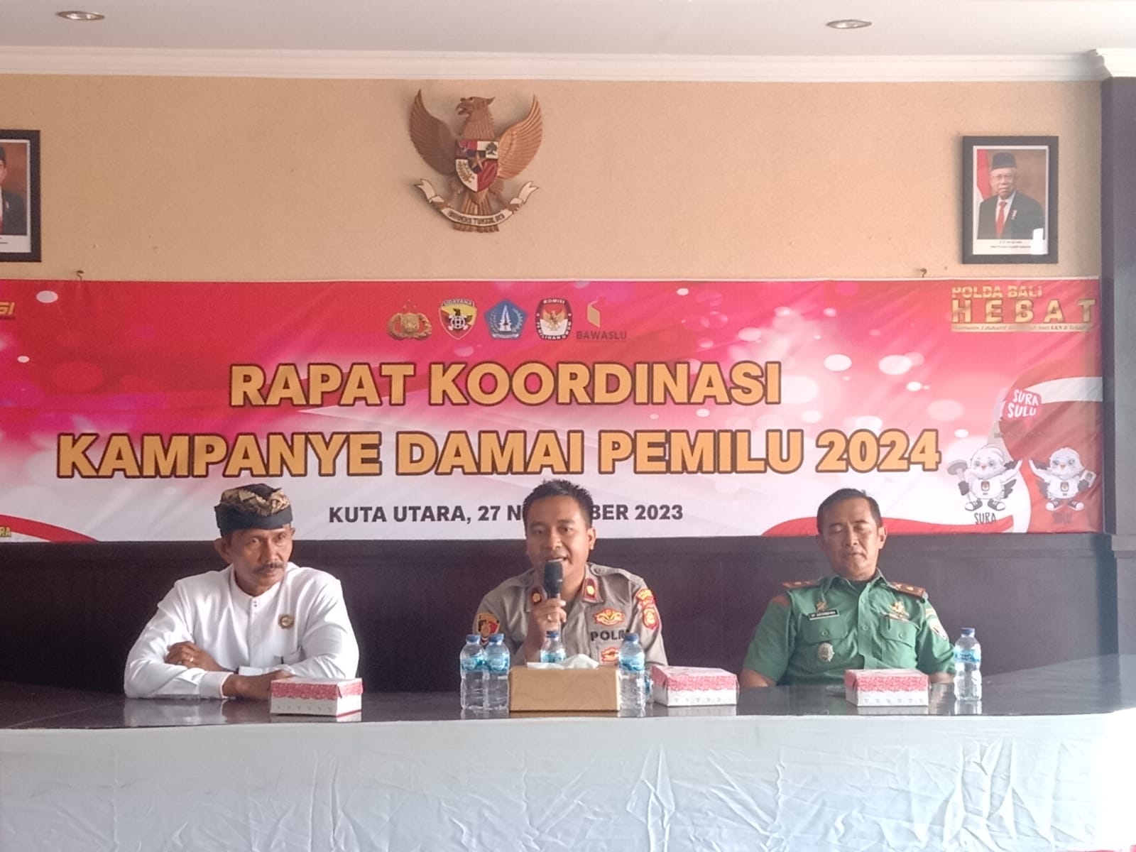 Kapolsek Kuta Utara Kompol Pramasetia SH.,S.I.K.,M.H seijin Kapolres Badung AKBP Teguh Priyo Wasono S.I.K menjelaskan Kegiatan rapat koordinasi Kampanye Damai Pemilu 2024 di lakukan guna menciptakan wilayah Kecamatan Kuta Utara yang aman kondusif selama masa tahapan Kampanye mulai tanggal 28 November 2023 sampai dengan 10 Pebruari 2024. hingga pada hari pemungutan suara nantinya.