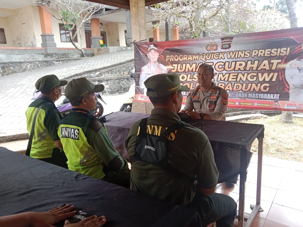 Dalam kegiatan Jumat Curhat Kali ini Kanit Binmas Polsek Mengwi AKP Ida Bagus Ketut Mantra selaku narasumber bertatap muka langsung dengan anggota Linmas Desa Mengwi untuk bertukar informasi terkait gangguan kamtibmas yang terjadi dilingkungannya.