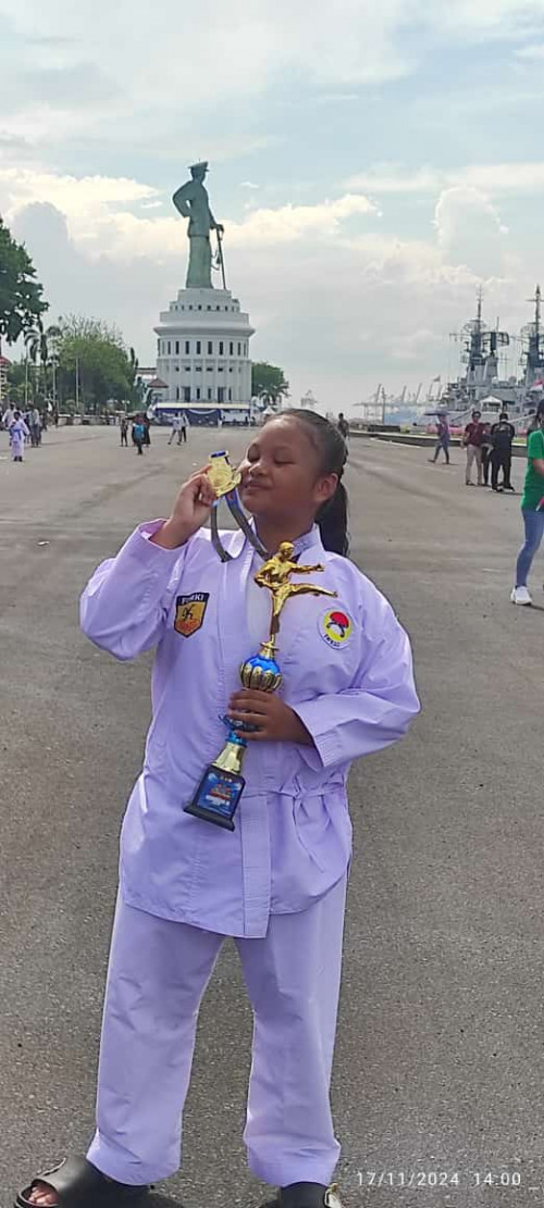 Bocah cantik dan tengil putri dari Aiptu Dodik, yang saat ini masih duduk di bangku SD kelas 6 SDN Sukabumi 2 bernama Putri Dinda Aura Ramadhani, lagi-lagi berhasil menunjukkan prestasinya dengan memboyong medali Emas di ajang Piala Karate Panglima Koarmada RI 2024.