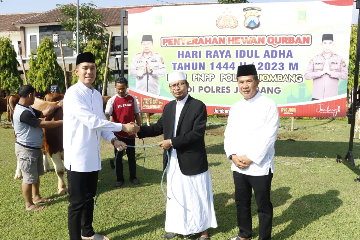 Penyerahan secara simbolis hewan kurban sapi dilakukan usai salat Idul Adha oleh Kapolres Jombang AKBP Eko Bagus Riyadi didampingi Wakapolres Kompol Hari Kurniawan kepada perwakilan Pondok Pesantren di lapangan Mapolres setempat, Kamis (29/6/2023) pagi.