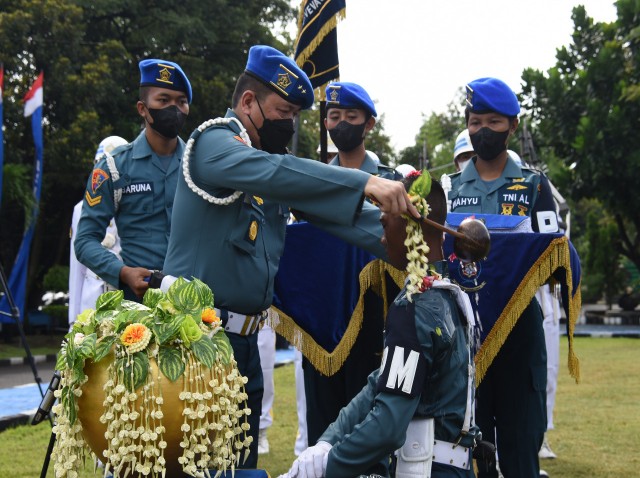 Danpuspomal dalam sambutannya menyampaikan bahwa upacara tradisi pembaretan ini merupakan bagian penting dan tidak terpisahkan dari perjalanan hidup seorang prajurit Polisi Militer Angkatan laut.