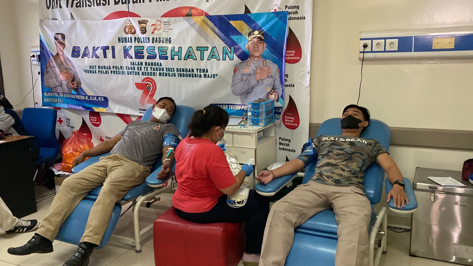 Suasana di ruang PMI Kabupaten Badung unit Transfusi darah cukup meriah menyambut HUT Humas Polri ke -72 tahun 2023 untuk memberikan sumbangsih darah mereka sebagai wujud kepedulian terhadap sesama.
