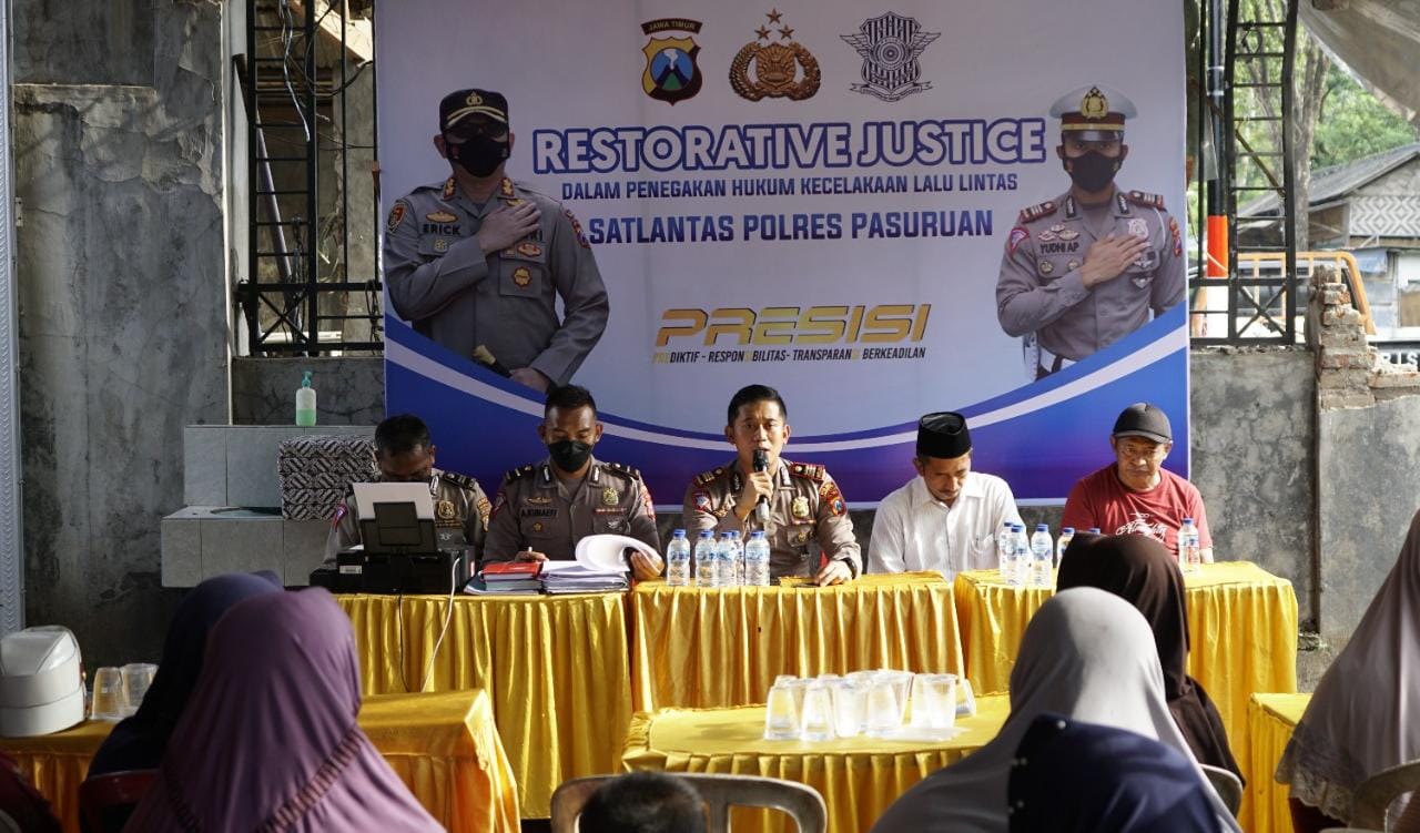 Dalam pelaksanaan kegiatan Restorative Justice ini Kasat Lantas Polres Pasuruan AKP Yudhi Anugrah Putra, S.I.K., M.H. memimpin langsung dalam penyelesaian perkara tindak pidana dengan melibatkan pelaku, korban, keluarga pelaku dan pihak lainnya yang terkait untuk bersama-sama dalam mencari penyelesaian yang adil dengan menekankan pemulihan Kembali pada keadaan semula melainkan bukan pembalasan.