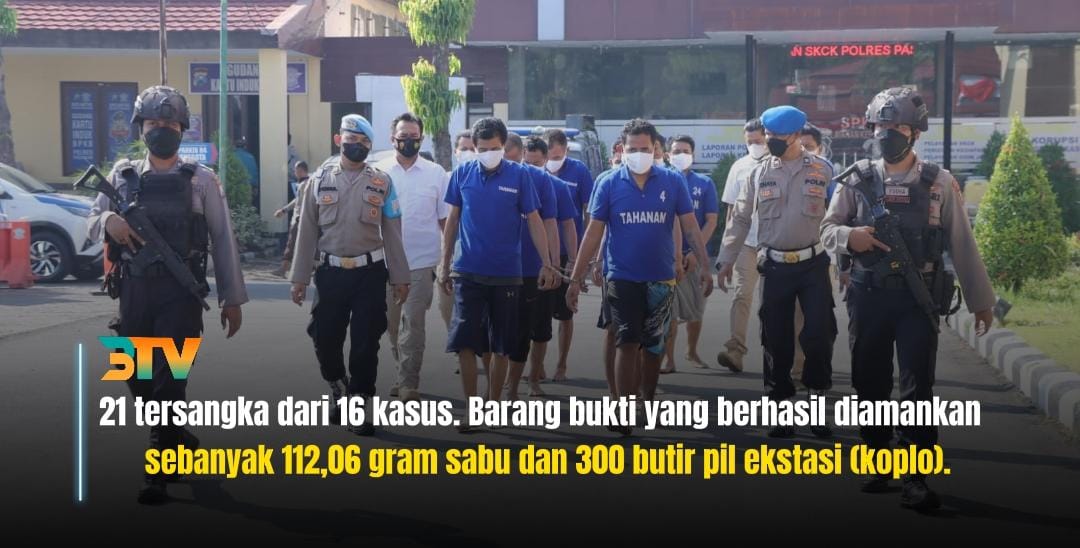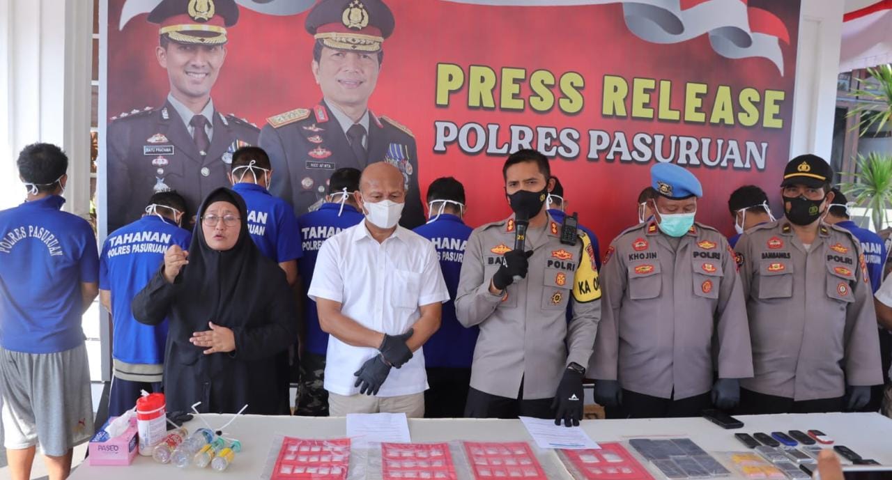 Brilian°PASURUAN – Tak henti-hentinya Polres Pasuruan terus menyuarakan Perang terhadap narkoba. Terbukti, selama Juli 2022, Satresnarkoba Polres Pasuruan berhasil menangkap 21 tersangka dari 16 kasus. Barang bukti yang berhasil diamankan sebanyak 112,06 gram sabu dan 300 butir pil ekstasi (koplo).