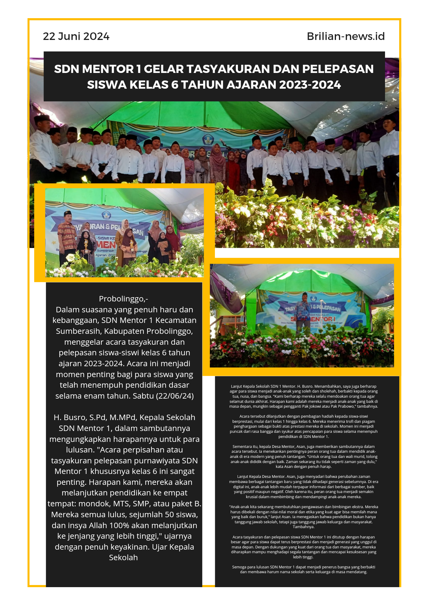 Probolinggo | Brilian-news.id,-Dalam suasana yang penuh haru dan kebanggaan, SDN Mentor 1 Kecamatan Sumberasih, Kabupaten Probolinggo, menggelar acara tasyakuran dan pelepasan siswa-siswi kelas 6 tahun ajaran 2023-2024. Acara ini menjadi momen penting bagi para siswa yang telah menempuh pendidikan dasar selama enam tahun. Sabtu (22/06/24)
