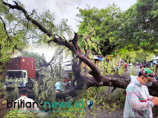 Brilian°Pasuruan – Hujan lebat di sertai angin kencang menerjang Dusun Talun, Desa Gununggangsir, Kecamatan Beji Kabupaten Pasuruan mengakibatkan 4 pohon tumbang, dan menimpa satu warung milik warga. senin 27/12/2021.