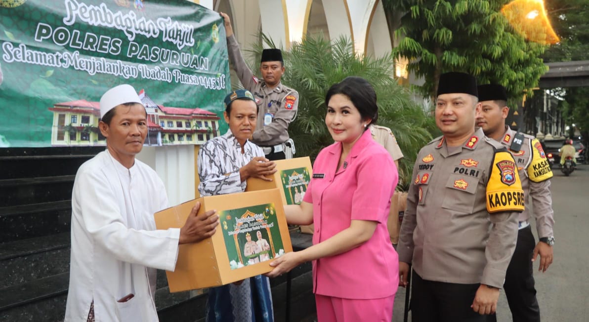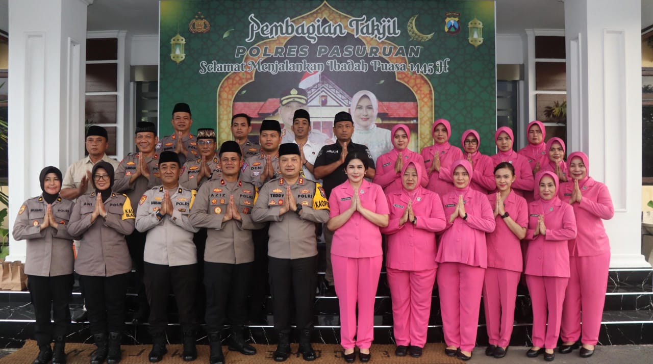 Pembagian takjil tersebut langsung dilakukan oleh Kapolres Pasuruan AKBP Teddy Chandra didampingi Ketua Bhayangkari Cabang Pasuruan NY Silvi Teddy Chandra beserta pejabat utama Polres Pasuruan.
