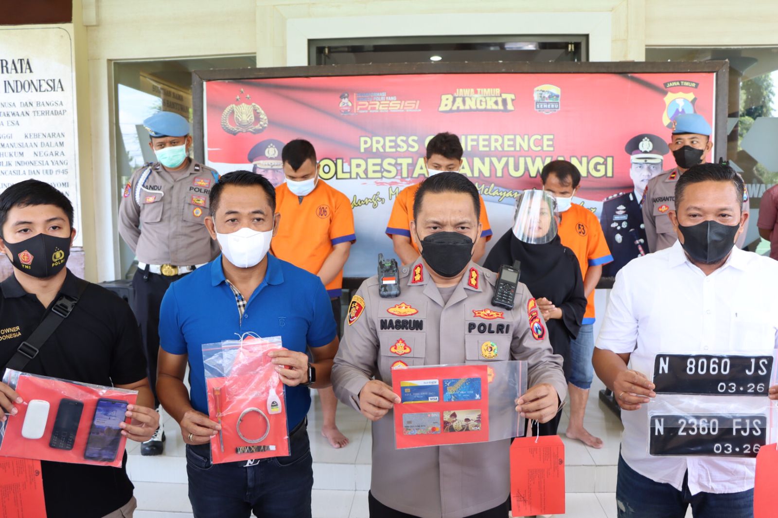 Banyuwangi : Satuan Reserse Kriminal (Satreskrim) Polresta Banyuwangi berhasil mengamankan sindikat pelaku pencurian dengan modus ganjal mesin gerai ATM. Kapolresta Banyuwangi AKBP Nasrun Pasaribu menggelar konferensi pers Selasa (14/12) di Joglo Polresta Banyuwangi dengan didampingi Kasat Reskrim AKP Iwan Hari Kasi Humas Iptu Lita Kurniawan, KBO Reskrim Iptu Badrodin Hidayat, dan Kanit Resmob Iptu Ardhi Bitakumala.