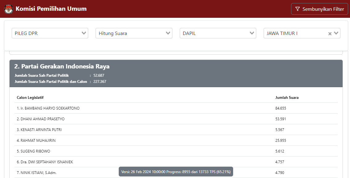 Hasil real count KPU pada Senin (26/2) pukul 10.00 WIB dengan total suara masuk 65,21% TPS, Bambang Haryo (Gerindra) unggul jauh dengan perolehan suara sebesar 84.665, lalu di posisi kedua Adies Kadir dengan perolehan 57.670.