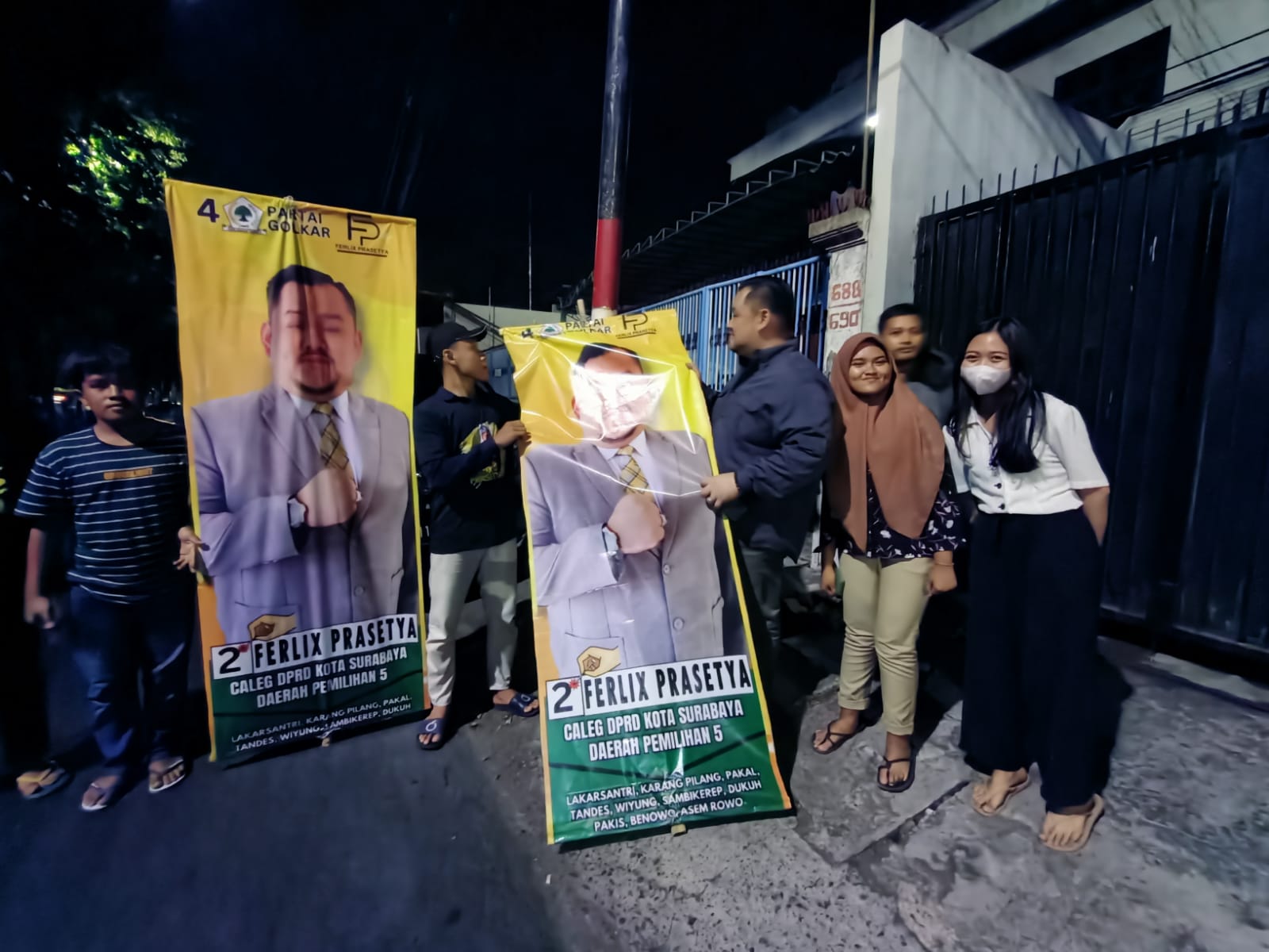 Brilian°Surabaya – Merespon tindakan Badan Pengawas Pemilihan Umum (Bawaslu) Surabaya, Tim Rumah Pemenangan Ferlix Prasetya (FP) melakulan penertiban Alat Peraga Sosialisasi (APS) yang mirip Alat Peraga Kampanye (APK) secara mandiri, Rabu (22/11/2023) malam.