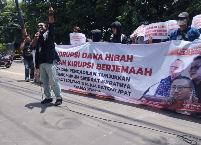 Koordinator Aksi Jaka Jatim, Musfiq, menegaskan bahwa ketidakhadiran Gubernur sebagai saksi merupakan sikap yang sangat disayangkan dan berpotensi melukai rasa keadilan publik.