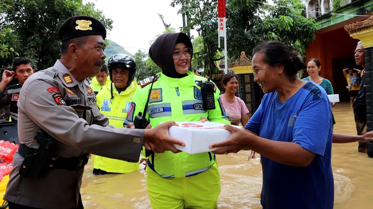 Sementara itu Kasat Lantas Trenggalek AKP Meita juga mendatangi pemukiman warga yang terendam banjir sembari membagikan nasi kotak.