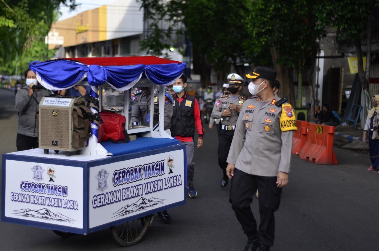 Gerobak vaksin itu, dibawa langsung ke pasar tradisional. Sementara polisi yang bertugas, termasuk Kapolres, menjemput pedagang dan pembeli lansia di pasar, untuk ikut vaksin.