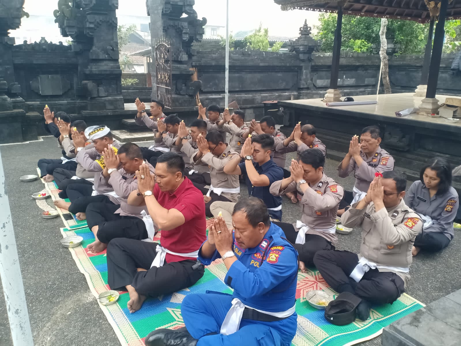 Brilian-news.id | Bali – Untuk meningkatkan keimanan dan ketaqwaan terhadap Tuhan Yang Maha Esa personel Polres Badung yang beragama Hindu melaksanakan sembahyang bersama di pura Catur Giri Loka Polres Badung Jl. Kebo Iwa No. 1 Mengwitani, Kecamatan Mengwi Kabupaten Badung, Bali. Kamis (14/09) pagi pukul 09.00 wita.