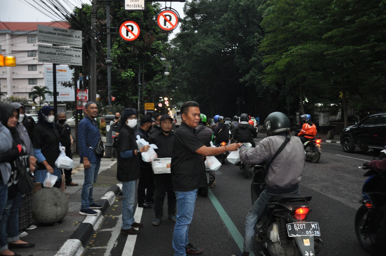 Karenanya tak pelak, pengendara yang melintas di Jalan Merdeka, baik supir bis, supir dan penumpang angkot, driver Ojol, pedagang asongan maupun masyarakat sekitar banyak yang menerima paket dengan sukacita.