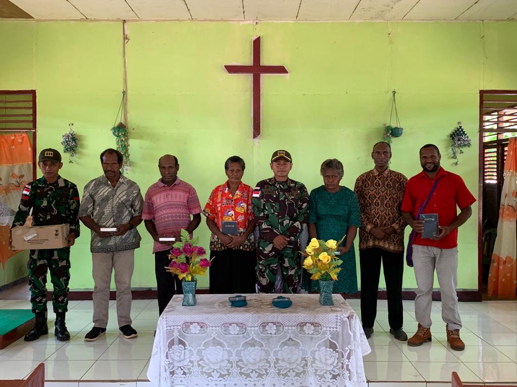 Brilian News – Sebagai wujud kepedulian terhadap kehidupan beragama, Pos Toray Satgas Pamtas RI-PNG Yonif 511/DY memberikan bantuan Alkitab kepada jemaat Gereja PKAI Jemaat Berakha di Kampung Toray, Distrik Sota, Kabupaten Merauke.