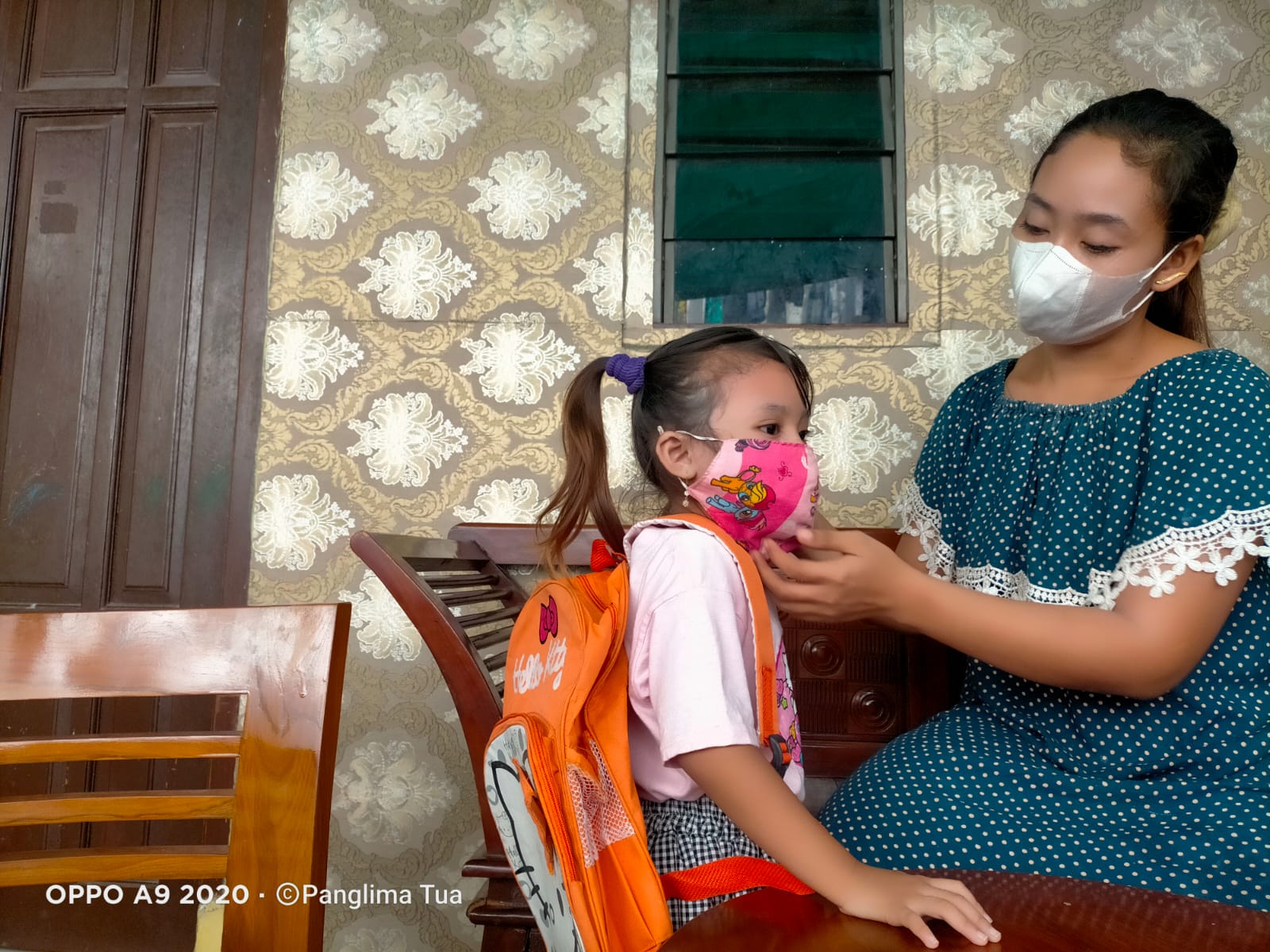 “Ayo belajar pakai masker ya, gak boleh dilepas maskernya, nanti biar virusnya hilang,” ujar Ibunya Jihan sembari memakaikan masker pada putrinya.