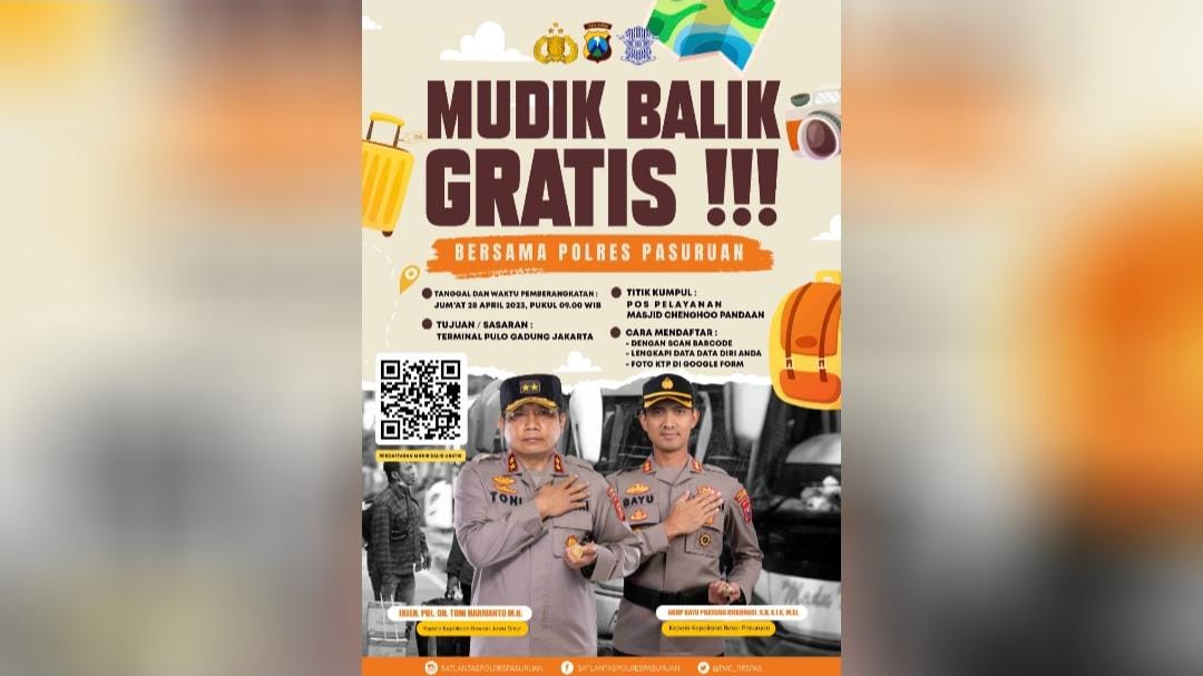 Brilian°PASURUAN – Kepolisian Resor Pasuruan memberikan layanan balik gratis bagi para pemudik yang akan kembali ke Jakarta setelah mudik Lebaran tahun ini.